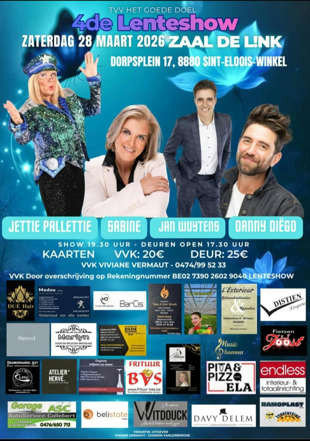 Voor de 4de maal op rij mogen wij voor jullie onze Lenteshow presenteren. We willen op deze avond jong en oud samen brengen om een feestje te bouwen! Dit jaar zorgen Zangeres Sabine, Jan Wuyttens, Danny Diëgo en Jettie Pallettie voor de nodige ambiance. Wees allen van harte welkom!