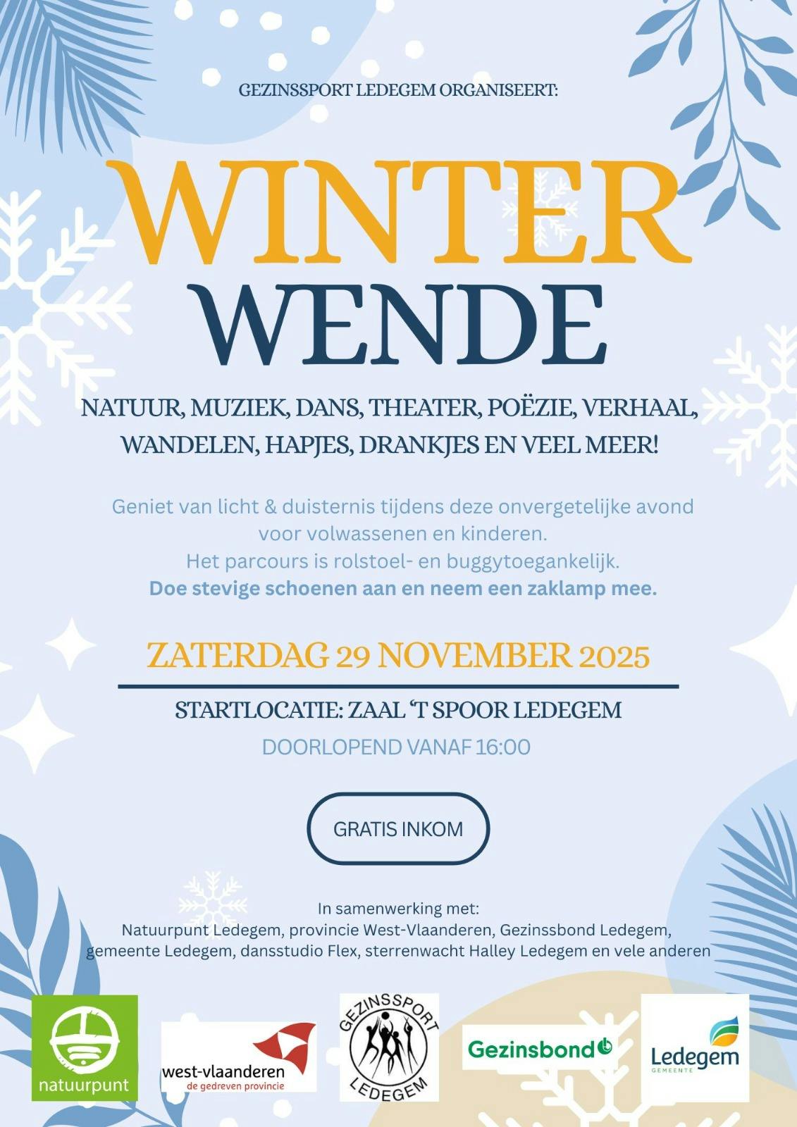 Een uniek evenement in en rond de Ledegemse Meersen. Waar we wandelen combineren met muziek, poëzie,de natuurelementen, dans, Theater, verhaal enz... Laat je verrassen in licht en duisternis en ga verwonderd de nacht in.